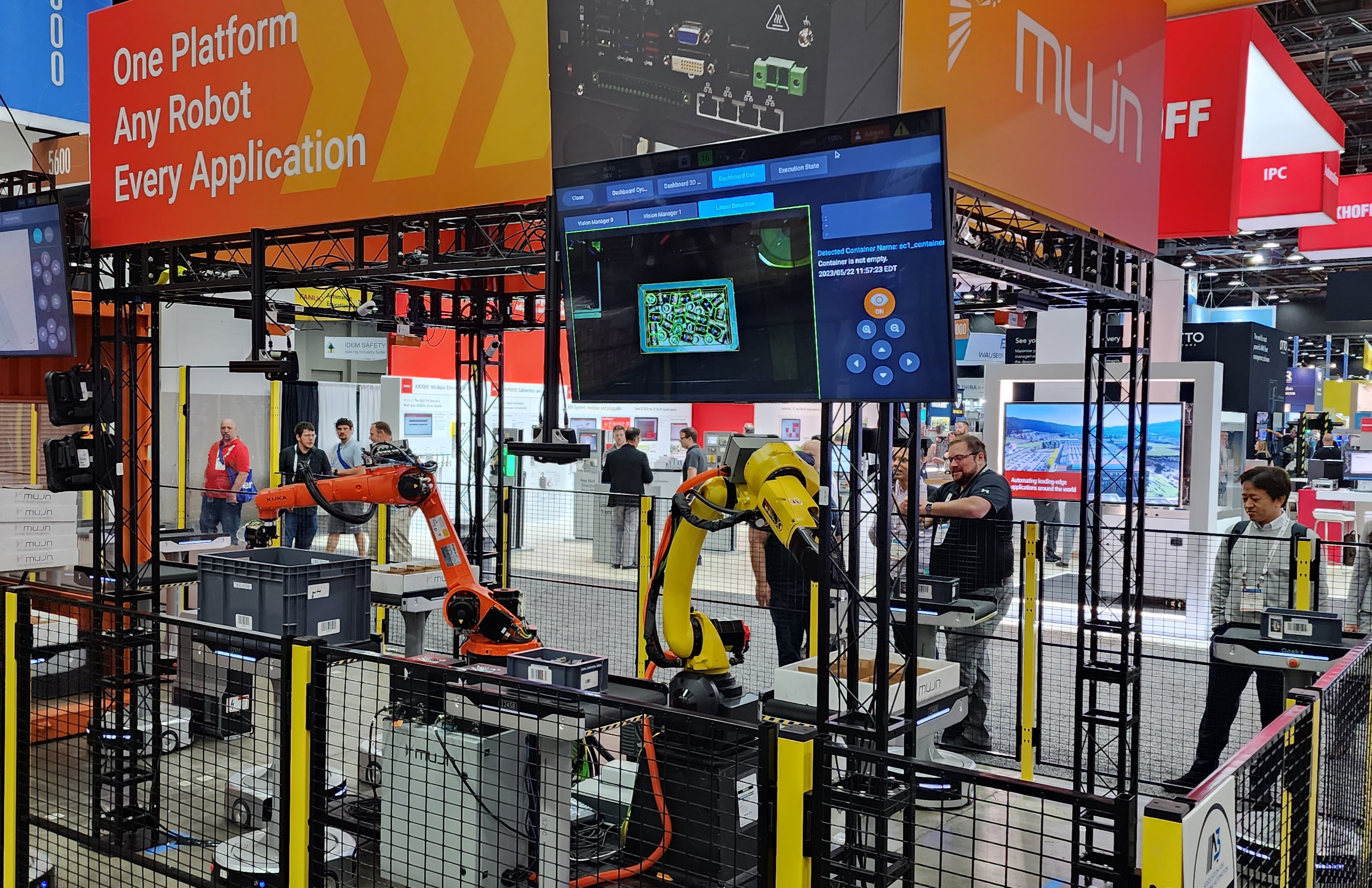 One of the biggest advantages of MODEX is the ability to experience solutions live. At the Mujin booth in Hall B, Booth B9519, we have live demonstration with industry partners like Yaskawa, FANUC, Schmalz, SICK, and Kawaski.